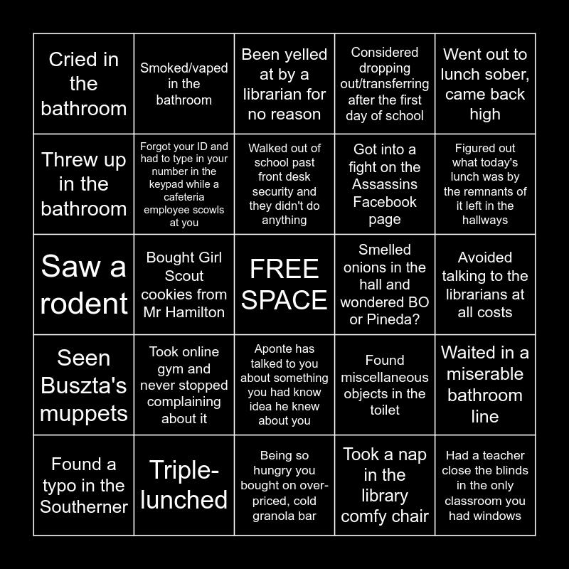 This bingo card has a free space and 24 words: Took online gym and never stopped complaining about it, Triple-lunched, Walked out of school past front desk security and they didn't do anything, Found a typo in the Southerner, Went out to lunch sober, came back high, Cried in the bathroom, Threw up in the bathroom, Smoked/vaped in the bathroom, Smelled onions in the hall and wondered BO or Pineda?, Aponte has talked to you about something you had know idea he knew about you, Got into a fight on the Assassins Facebook page, Saw a rodent, Found miscellaneous objects in the toilet, Waited in a miserable bathroom line, Forgot your ID and had to type in your number in the keypad while a cafeteria employee scowls at you, Took a nap in the library comfy chair, Avoided talking to the librarians at all costs, Been yelled at by a librarian for no reason, Figured out what today's lunch was by the remnants of it left in the hallways, Bought Girl Scout cookies from Mr Hamilton, Had a teacher close the blinds in the only classroom you had windows, Seen Buszta's muppets, Considered dropping out/transferring after the first day of school and Being so hungry you bought on over-priced, cold granola bar.