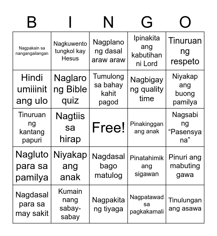 This bingo card has a free space and 75 words: Sama-samang nag-Bible reading, Sabay Sabay nagdarasal, Nagplano ng dasal araw araw, Gumawa ng prayer journal, Nagsulat ng dasal, Nakinig ng awiting Kristiyano, Nanonood ng Christian movie, Nagbasa ng Bible, Nagkwentuhan tungkol sa Diyos, Nagplano ng lingguhang panalangin sa pamilya, Nagpakumbaba sa asawa, Nagpakita ng kabaitan sa pamilya, Tumulong sa bahay kahit pagod, Hindi umiiinit ang ulo, Umamin ng pagkakamali, Nagtiis sa hirap, Nagpakita ng pasensya, Tinulungan ang asawa, Tinulungan ang kapatid, Tinuruan ng respeto, Tinuruan ng Bible verse, Tinuruan ng kantang papuri, Naglaro ng Bible quiz, Nagkuwento tungkol kay Hesus, Ipinakita ang kabutihan ni Lord, Tinuruan ng Sampung Utos, Gumawa ng gawaing may kabutihan, Inakay sa tamang landas, Tinuruan ng pagiging mapagkumbaba, Ipinaliwanag ang pananampalataya, Nagplano ng araw ng pamilya, Inaya ang anak magdasal, Nakinig ng walang pagputol, Pinatahimik ang sigawan, Niyakap ang buong pamilya, Nagbigay ng quality time, Nagbigay ng simpleng regalo, Niyakap ang asawa, Nagsabi ng “Pasensya na”, Nagpatawad sa pagkakamali, Bumisita sa kamag anak, Tumulong sa gawain sa service, Sumama sa Bible study, Nagbigay ng tulong, Tumulong sa hindi ka kilala, Nakiisa/Makiki-isa sa family day ng simbahan, Nagdasal para sa may sakit, Nagpakain sa nangangailangan, Naglinis ng worship hall, Sumali sa choir o ministry, Nagdasal kasama ang anak, Nagdasal bago matulog, Nagdasal bago kumain, Sama-samang nagdasal, Sumama sa Service, Nagbasa ng Bibliya bilang pamilya, Sumama sa Worship, Nag-alay ng panalangin para sa iba, Nagturo ng Dasal sa hindi kakilala, Nagshare ng verse sa iba, Niyakap ang anak, Kinausap nang maayos ang anak, Naglaro kasama ang anak, Nagturo ng mabuting asal, Nagkuwento ng Bible story, Pinakinggan ang anak, Nagturo ng dasal, Nagsabing “Mahal kita”, Nagpasalamat sa anak, Pinuri ang mabuting gawa, Nagluto para sa pamilya, Kumain nang sabay-sabay, Nagplano ng family bonding, Nagpakita ng tiyaga and Tinuruan ng gawaing bahay ang anak.