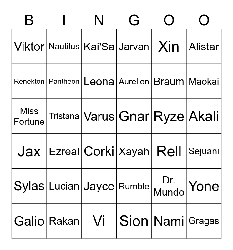 This bingo card has 36 words: Rumble, Jayce, Sion, Renekton, Jax, Gnar, Pantheon, Vi, Xin, Dr. Mundo, Maokai, Jarvan, Yone, Tristana, Aurelion, Viktor, Sylas, Ryze, Miss Fortune, Kai'Sa, Varus, Ezreal, Xayah, Corki, Rell, Nautilus, Braum, Rakan, Leona, Alistar, Gragas, Galio, Sejuani, Akali, Lucian and Nami.