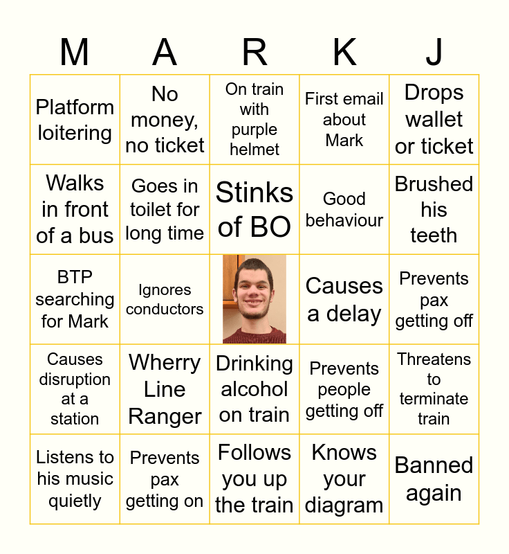 This bingo card has a free space and 24 words: Wherry Line Ranger, Prevents pax getting on, Stinks of BO, Listens to his music quietly, Drops wallet or ticket, Platform loitering, Walks in front of a bus, No money, no ticket, Causes a delay, Drinking alcohol on train, Good behaviour, BTP searching for Mark, Prevents people getting off, Threatens to terminate train, Goes in toilet for long time, Knows your diagram, Prevents pax getting off, On train with purple helmet, Brushed his teeth, Ignores conductors, Banned again, Causes disruption at a station, First email about Mark and Follows you up the train.