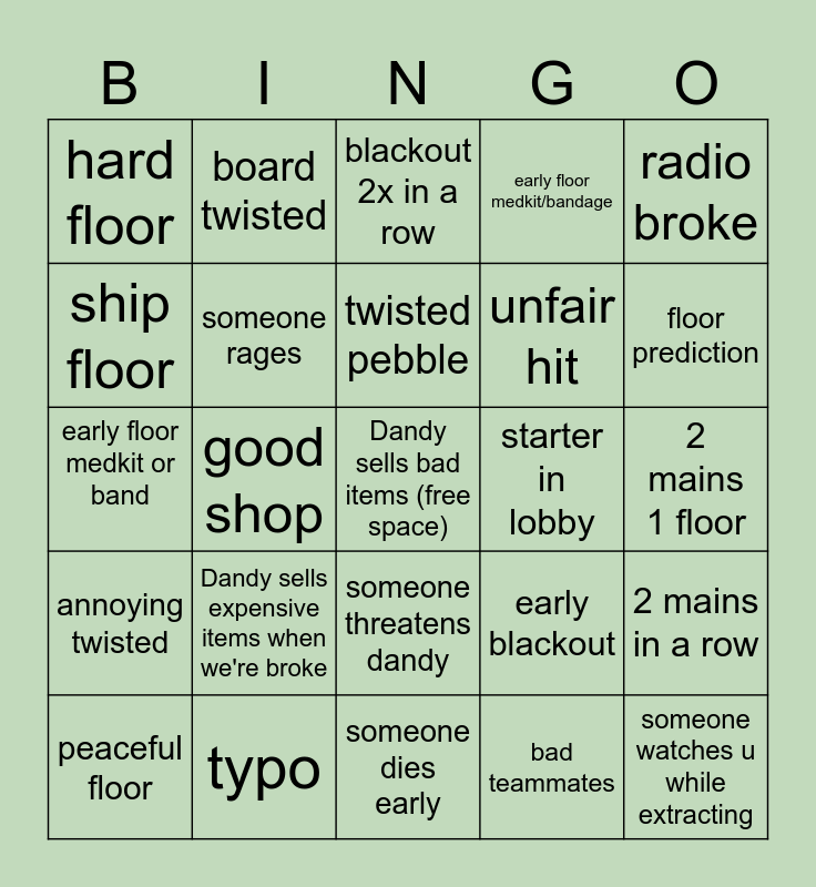 This bingo card has a free space and 29 words: peaceful floor, ur only one left alive, good shop, some one steals item from u, hard floor, blackout 2x in a row, someone rages, Dandy sells expensive items when we're broke, starter in lobby, typo, 2 mains 1 floor, someone watches u while extracting, someone dies early, bad teammates, floor prediction, someone clutches, someone threatens dandy, annoying twisted, radio broke, early floor medkit or band, early blackout, dandy finally sells med/band, unfair hit, ship floor, early floor medkit/bandage, board twisted, 2 mains in a row, twisted pebble and lucky gamble.