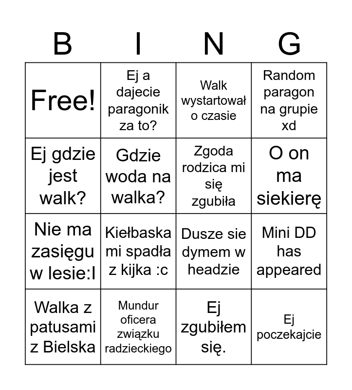 This bingo card has 16 words: Walka z patusami z Bielska, Mundur oficera związku radzieckiego, Walk wystartował o czasie, Random paragon na grupie xd, Ej gdzie jest walk?, Ej a dajecie paragonik za to?, Dusze sie dymem w headzie, Mini DD has appeared, Free!, Gdzie woda na walka?, Ej zgubiłem się., O on ma siekierę, Nie ma zasięgu w lesie:I, Kiełbaska mi spadła z kijka :c, Zgoda rodzica mi się zgubiła and Ej poczekajcie.