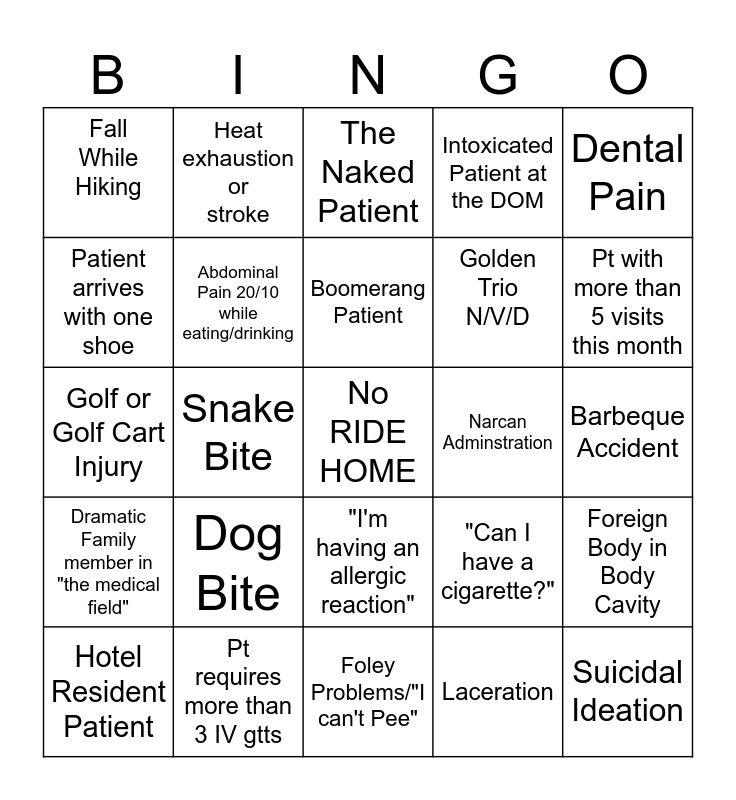 This bingo card has a free space and 25 words: Dog Bite, Foley Problems/"I can't Pee", Boomerang Patient, Hotel Resident Patient, Dental Pain, Fall While Hiking, Patient arrives with one shoe, Heat exhaustion or stroke, Narcan Adminstration, "I'm having an allergic reaction", Golden Trio N/V/D, Golf or Golf Cart Injury, "Can I have a cigarette?", Foreign Body in Body Cavity, Abdominal Pain 20/10 while eating/drinking, Sunburn, Barbeque Accident, The Naked Patient, Pt with more than 5 visits this month, Snake Bite, Suicidal Ideation, Pt requires more than 3 IV gtts, Dramatic Family member in "the medical field", Intoxicated Patient at the DOM and Laceration.
