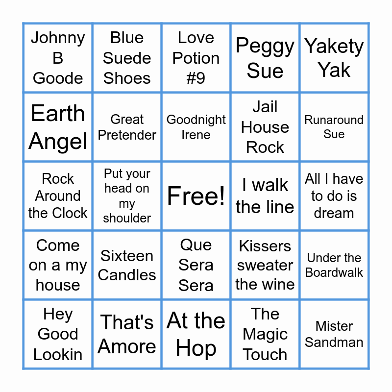 This bingo card has a free space and 24 words: Sixteen Candles, That's Amore, Goodnight Irene, Hey Good Lookin, Yakety Yak, Johnny B Goode, Earth Angel, Blue Suede Shoes, I walk the line, Que Sera Sera, Jail House Rock, Rock Around the Clock, Kissers sweater the wine, Under the Boardwalk, Great Pretender, The Magic Touch, All I have to do is dream, Love Potion #9, Runaround Sue, Put your head on my shoulder, Mister Sandman, Come on a my house, Peggy Sue and At the Hop.