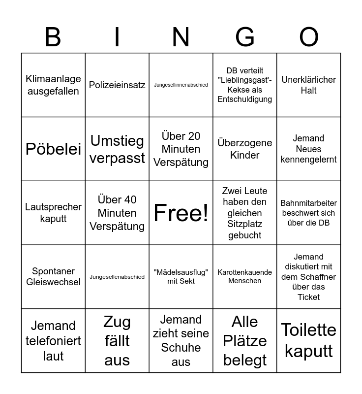 This bingo card has a free space and 24 words: Jungesellenabschied, Zug fällt aus, Über 20 Minuten Verspätung, Jemand telefoniert laut, Unerklärlicher Halt, Klimaanlage ausgefallen, Pöbelei, Polizeieinsatz, Zwei Leute haben den gleichen Sitzplatz gebucht, "Mädelsausflug" mit Sekt, Überzogene Kinder, Lautsprecher kaputt, Karottenkauende Menschen, Jemand diskutiert mit dem Schaffner über das Ticket, Umstieg verpasst, Alle Plätze belegt, Bahnmitarbeiter beschwert sich über die DB, Jungesellinnenabschied, Jemand Neues kennengelernt, Über 40 Minuten Verspätung, Toilette kaputt, Spontaner Gleiswechsel, DB verteilt "Lieblingsgast'-Kekse als Entschuldigung and Jemand zieht seine Schuhe aus.