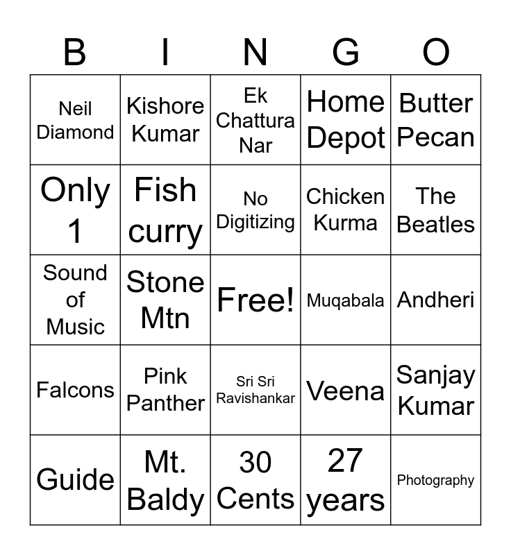 This bingo card has a free space and 32 words: 27 years, City Univ of NY, Stone Mtn, MJ, Falcons, Fish curry, Butter Pecan, Sanjay Kumar, Kishore Kumar, Katrina Kaif, No Digitizing, Ek Chattura Nar, Mt. Leconte, Saxophone, Muqabala, All of them, Guide, Sound of Music, Sri Sri Ravishankar, Pink Panther, Veena, Goa, Andheri, Mt. Baldy, Photography, Home Depot, Chicken Kurma, Only 1, Neil Diamond, 30 Cents, Lal Bahadur Shastri and The Beatles.