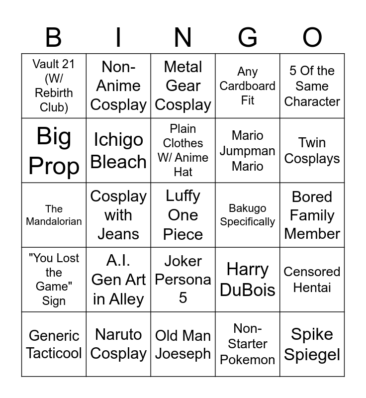 This bingo card has a free space and 24 words: A.I. Gen Art in Alley, Naruto Cosplay, Plain Clothes W/ Anime Hat, Generic Tacticool, 5 Of the Same Character, Vault 21 (W/ Rebirth Club), Big Prop, Non-Anime Cosplay, Bakugo Specifically, Joker Persona 5, Mario Jumpman Mario, The Mandalorian, Harry DuBois, Censored Hentai, Ichigo Bleach, Non-Starter Pokemon, Bored Family Member, Metal Gear Cosplay, Twin Cosplays, Cosplay with Jeans, Spike Spiegel, "You Lost the Game" Sign, Any Cardboard Fit and Old Man Joeseph.