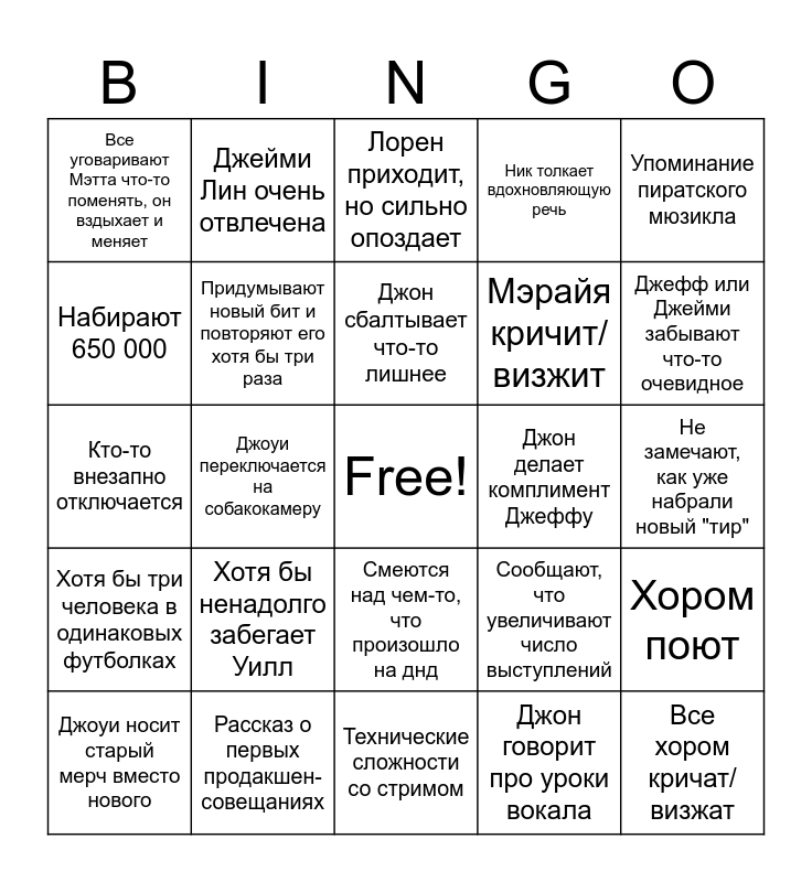 This bingo card has a free space and 24 words: Хотя бы ненадолго забегает Уилл, Рассказ о первых продакшен-совещаниях, Джон сбалтывает что-то лишнее, Джоуи носит старый мерч вместо нового, Упоминание пиратского мюзикла, Все уговаривают Мэтта что-то поменять, он вздыхает и меняет, Набирают 650 000, Джейми Лин очень отвлечена, Джон делает комплимент Джеффу, Смеются над чем-то, что произошло на днд, Мэрайя кричит/визжит, Кто-то внезапно отключается, Сообщают, что увеличивают число выступлений, Хором поют, Придумывают новый бит и повторяют его хотя бы три раза, Джон говорит про уроки вокала, Не замечают, как уже набрали новый "тир", Лорен приходит, но сильно опоздает, Джефф или Джейми забывают что-то очевидное, Джоуи переключается на собакокамеру, Все хором кричат/визжат, Хотя бы три человека в одинаковых футболках, Ник толкает вдохновляющую речь and Технические сложности со стримом.