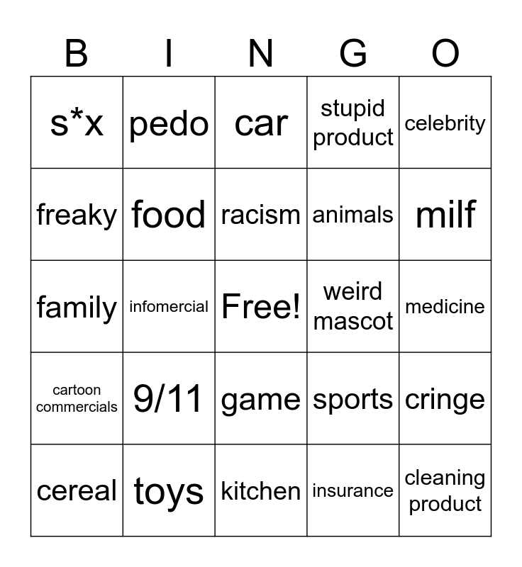 This bingo card has a free space and 24 words: 9/11, toys, racism, cereal, celebrity, s*x, freaky, pedo, weird mascot, game, animals, family, sports, cringe, food, insurance, medicine, car, milf, infomercial, cleaning product, cartoon commercials, stupid product and kitchen.
