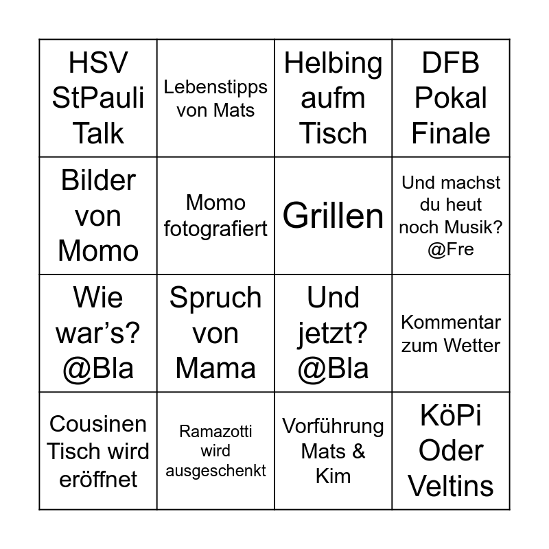 This bingo card has 16 words: Ramazotti wird ausgeschenkt, Kommentar zum Wetter, Helbing aufm Tisch, HSV StPauli Talk, Wie war’s? @Bla, Lebenstipps von Mats, Und jetzt? @Bla, Vorführung Mats & Kim, Bilder von Momo, Momo fotografiert, Cousinen Tisch wird eröffnet, DFB Pokal Finale, Spruch von Mama, Und machst du heut noch Musik? @Fre, Grillen and KöPi Oder Veltins.