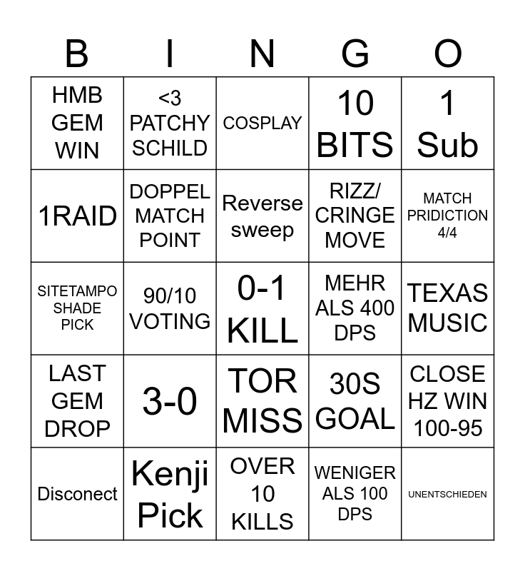 This bingo card has a free space and 24 words: 3-0, Kenji Pick, Reverse sweep, Disconect, 1 Sub, HMB GEM WIN, 1RAID, <3 PATCHY SCHILD, MEHR ALS 400 DPS, TOR MISS, RIZZ/ CRINGE MOVE, SITETAMPO SHADE PICK, 30S GOAL, CLOSE HZ WIN 100-95, DOPPEL MATCH POINT, WENIGER ALS 100 DPS, TEXAS MUSIC, COSPLAY, MATCH PRIDICTION 4/4, 90/10 VOTING, UNENTSCHIEDEN, LAST GEM DROP, 10 BITS and OVER 10 KILLS.