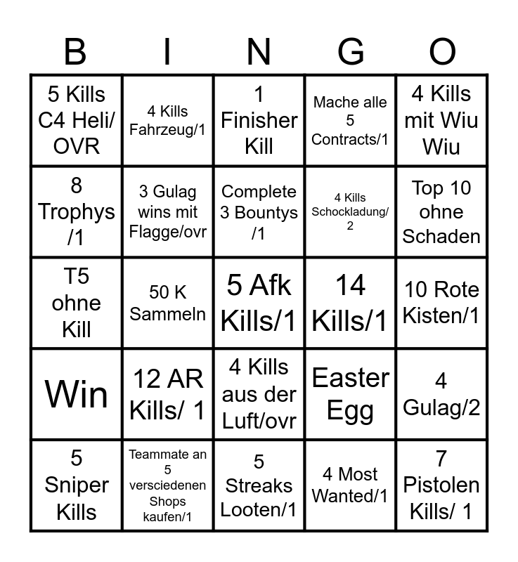 This bingo card has 25 words: 12 AR Kills/ 1, 5 Streaks Looten/1, Complete 3 Bountys /1, 5 Sniper Kills, 4 Kills mit Wiu Wiu, 5 Kills C4 Heli/ OVR, 8 Trophys /1, 4 Kills Fahrzeug/1, 14 Kills/1, 4 Kills aus der Luft/ovr, 4 Kills Schockladung/ 2, T5 ohne Kill, Easter Egg, 4 Gulag/2, 3 Gulag wins mit Flagge/ovr, 7 Pistolen Kills/ 1, 10 Rote Kisten/1, 1 Finisher Kill, Top 10 ohne Schaden, 50 K Sammeln, 5 Afk Kills/1, Teammate an 5 versciedenen Shops kaufen/1, Win, Mache alle 5 Contracts/1 and 4 Most Wanted/1.
