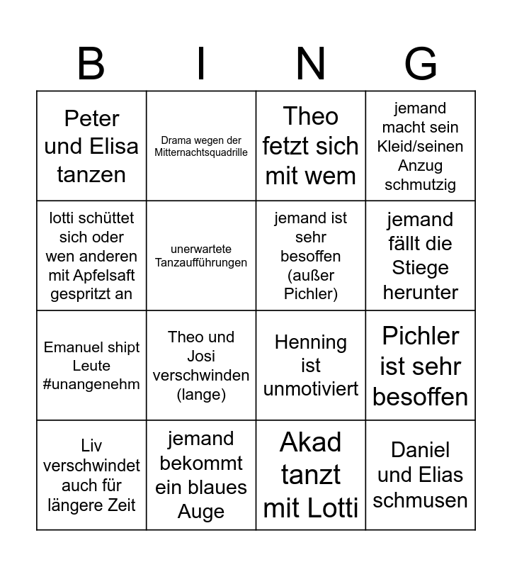 This bingo card has 16 words: jemand bekommt ein blaues Auge, Pichler ist sehr besoffen, Theo fetzt sich mit wem, Peter und Elisa tanzen, Emanuel shipt Leute #unangenehm, Drama wegen der Mitternachtsquadrille, Henning ist unmotiviert, Akad tanzt mit Lotti, lotti schüttet sich oder wen anderen mit Apfelsaft gespritzt an, unerwartete Tanzaufführungen, Liv verschwindet auch für längere Zeit, jemand macht sein Kleid/seinen Anzug schmutzig, Theo und Josi verschwinden (lange), jemand fällt die Stiege herunter, jemand ist sehr besoffen (außer Pichler) and Daniel und Elias schmusen.