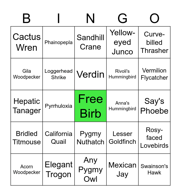 This bingo card has a free space and 24 words: California Quail, Elegant Trogon, Verdin, Acorn Woodpecker, Curve-billed Thrasher, Cactus Wren, Gila Woodpecker, Phainopepla, Anna's Hummingbird, Pygmy Nuthatch, Rivoli's Hummingbird, Hepatic Tanager, Lesser Goldfinch, Rosy-faced Lovebirds, Loggerhead Shrike, Mexican Jay, Say's Phoebe, Sandhill Crane, Vermilion Flycatcher, Pyrrhuloxia, Swainson's Hawk, Bridled Titmouse, Yellow-eyed Junco and Any Pygmy Owl.
