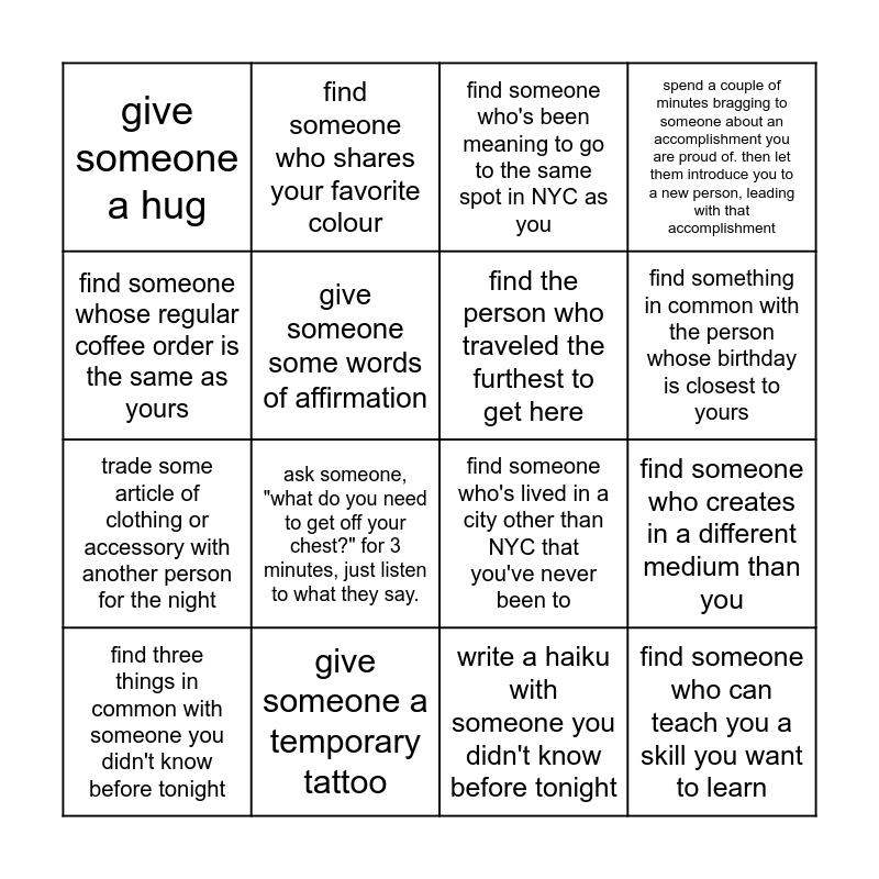 This bingo card has 32 words: find someone born in the same month as you, find someone who's wearing something they made themselves, find someone who creates in a different medium than you, find someone who's listened to a song this week that you have also listened to, find someone who can teach you a skill you want to learn, find the person who traveled the furthest to get here, find someone whose regular coffee order is the same as yours, find the person who lives closest to you (NOT your roommate), find someone who shares your favorite colour, find someone who can teach you an expression or idiom that you don't regularly use, find something in common with the person whose birthday is closest to yours, find someone who's been meaning to go to the same spot in NYC as you, find someone who's touched a body of water you've never touched, get matching temporary tattoos with someone you didn't know before tonight, give someone a temporary tattoo, name one thing you don't like doing by yourself _________________ find someone who also doesn't like doing that thing alone, find someone in the same place in the sibling order as you (e.g. youngest, 2nd oldest, etc.), find someone who's lived in a city other than NYC that you've never been to, find someone who's been meaning to get rid of something that you want/need, think about your perfect day. find someone whose perfect day includes some of the same elements., find someone who's done something you're scared to do, create an exquisite corpse drawing with 2 people you didn't know before tonight, write a haiku with someone you didn't know before tonight, find someone who likes a food you dislike, find three things in common with someone you didn't know before tonight, spend a couple of minutes bragging to someone about an accomplishment you are proud of. then let them introduce you to a new person, leading with that accomplishment, trade some article of clothing or accessory with another person for the night, give someone some words of affirmation, give someone a hug, get a drink or snack for someone, give someone a gift (no matter how small) and ask someone, "what do you need to get off your chest?" for 3 minutes, just listen to what they say..
