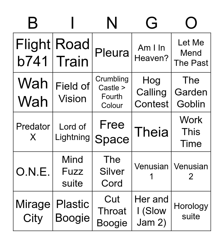 This bingo card has a free space and 24 words: Mind Fuzz suite, Plastic Boogie, Crumbling Castle > Fourth Colour, Mirage City, Let Me Mend The Past, Flight b741, Wah Wah, Road Train, Theia, The Silver Cord, Hog Calling Contest, Predator X, Venusian 1, Venusian 2, Field of Vision, Her and I (Slow Jam 2), Work This Time, Pleura, The Garden Goblin, Lord of Lightning, Horology suite, O.N.E., Am I In Heaven? and Cut Throat Boogie.