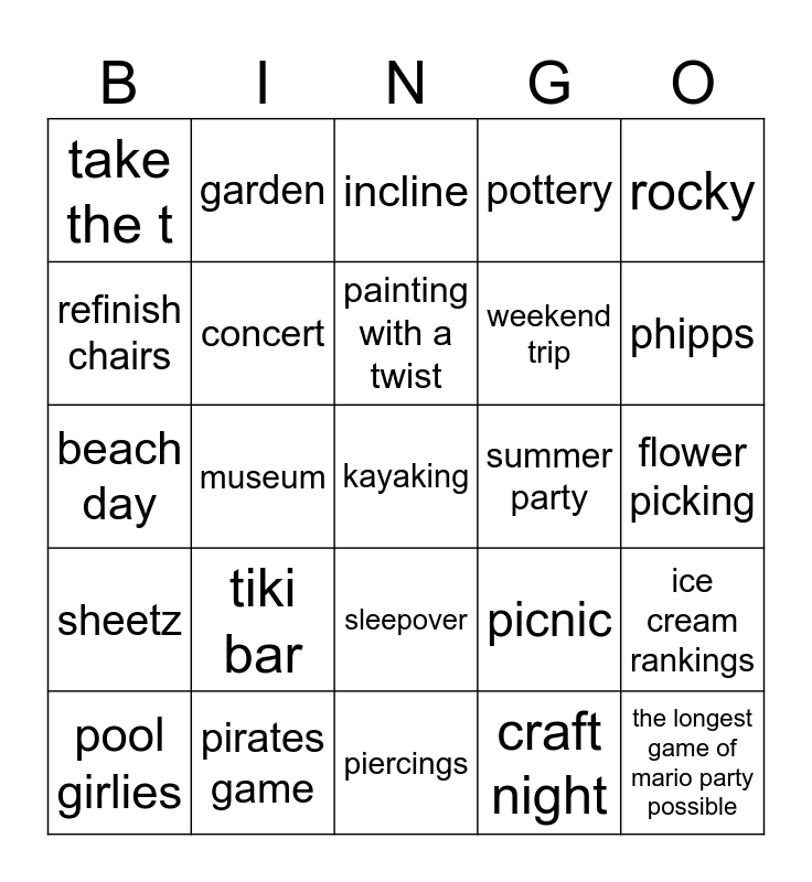 This bingo card has a free space and 24 words: tiki bar, pirates game, painting with a twist, pool girlies, rocky, take the t, refinish chairs, garden, summer party, sleepover, weekend trip, beach day, picnic, ice cream rankings, concert, craft night, flower picking, incline, phipps, museum, the longest game of mario party possible, sheetz, pottery and piercings.