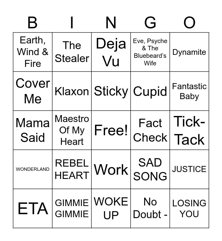 This bingo card has a free space and 35 words: Welcome To The Show, Home Sweet Home, Gangnam Style, Klaxon, Work, Eve, Psyche & The Bluebeard’s Wife, Cover Me, Given-Taken, Sticky, Sherlock, Mama Said, Dynamite, Erase Me, Chk Chk Boom, Earth, Wind & Fire, Fact Check, No Doubt -, Maestro Of My Heart, WONDERLAND, LOSING YOU, SAD SONG, ETA, JUSTICE, GIMMIE GIMMIE, Deja Vu, Fantastic Baby, Maria, I AM THE BEST, Cupid, Tick-Tack, Armageddon, WOKE UP, REBEL HEART, The Stealer and Very NICE.