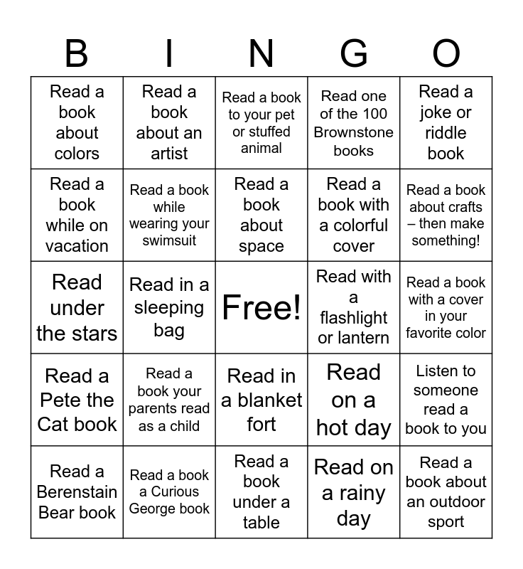 This bingo card has a free space and 24 words: Read a book your parents read as a child, Read a book a Curious George book, Read a book about space, Read a Berenstain Bear book, Read a joke or riddle book, Read a book about colors, Read a book while on vacation, Read a book about an artist, Read with a flashlight or lantern, Read in a blanket fort, Read a book with a colorful cover, Read under the stars, Read on a hot day, Listen to someone read a book to you, Read a book while wearing your swimsuit, Read on a rainy day, Read a book with a cover in your favorite color, Read a book to your pet or stuffed animal, Read a book about crafts – then make something!, Read in a sleeping bag, Read a book about an outdoor sport, Read a Pete the Cat book, Read one of the 100 Brownstone books and Read a book under a table.