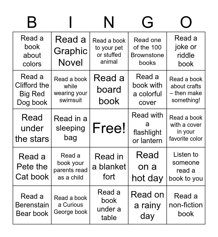 This bingo card has a free space and 24 words: Read a book your parents read as a child, Read a book a Curious George book, Read a board book, Read a Berenstain Bear book, Read a joke or riddle book, Read a book about colors, Read a Clifford the Big Red Dog book, Read a Graphic Novel, Read with a flashlight or lantern, Read in a blanket fort, Read a book with a colorful cover, Read under the stars, Read on a hot day, Listen to someone read a book to you, Read a book while wearing your swimsuit, Read on a rainy day, Read a book with a cover in your favorite color, Read a book to your pet or stuffed animal, Read a book about crafts – then make something!, Read in a sleeping bag, Read a non-fiction book, Read a Pete the Cat book, Read one of the 100 Brownstone books and Read a book under a table.
