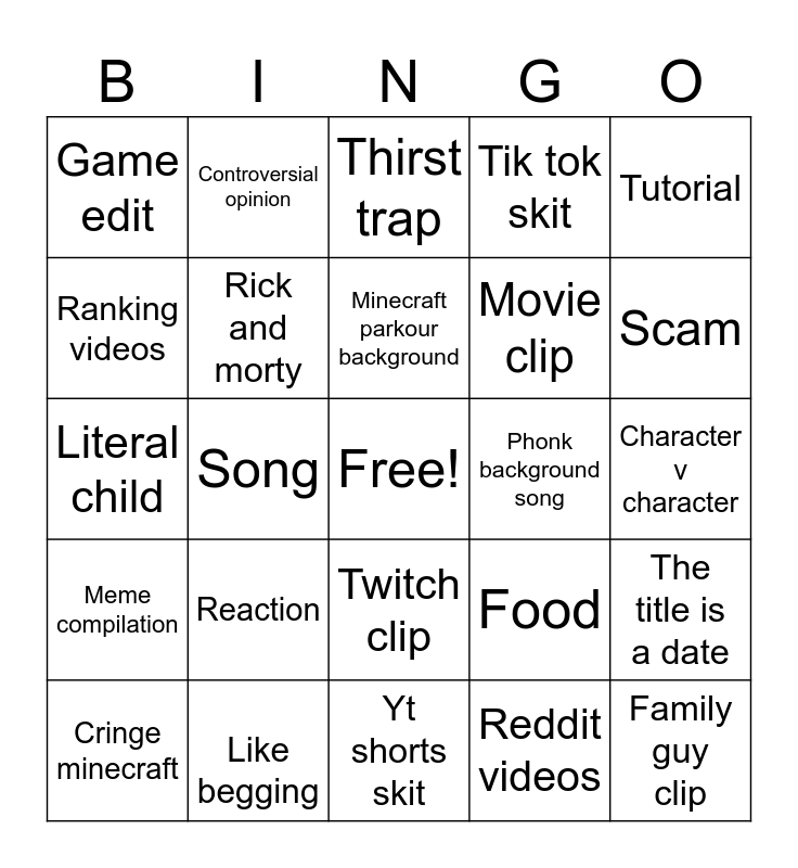 This bingo card has a free space and 24 words: Reaction, Like begging, Minecraft parkour background, Cringe minecraft, Tutorial, Game edit, Ranking videos, Controversial opinion, Phonk background song, Twitch clip, Movie clip, Literal child, Food, The title is a date, Rick and morty, Reddit videos, Character v character, Thirst trap, Scam, Song, Family guy clip, Meme compilation, Tik tok skit and Yt shorts skit.