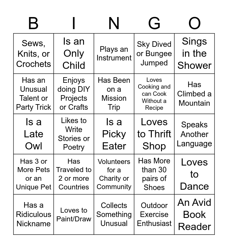 This bingo card has 25 words: Has Traveled to 2 or more Countries, Collects Something Unusual, Has Been on a Mission Trip, Has a Ridiculous Nickname, Sings in the Shower, Sews, Knits, or Crochets, Has an Unusual Talent or Party Trick, Is an Only Child, Loves to Thrift Shop, Volunteers for a Charity or Community, Loves Cooking and can Cook Without a Recipe, Is a Late Owl, Has More than 30 pairs of Shoes, Loves to Dance, Enjoys doing DIY Projects or Crafts, An Avid Book Reader, Speaks Another Language, Plays an Instrument, Has Climbed a Mountain, Likes to Write Stories or Poetry, Is a Picky Eater, Loves to Paint/Draw, Has 3 or More Pets or an Unique Pet, Sky Dived or Bungee Jumped and Outdoor Exercise Enthusiast.