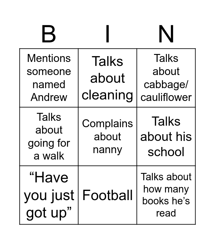 This bingo card has a free space and 8 words: Talks about his school, Talks about cabbage/ cauliflower, Talks about cleaning, “Have you just got up”, Mentions someone named Andrew, Talks about how many books he’s read, Talks about going for a walk and Football.
