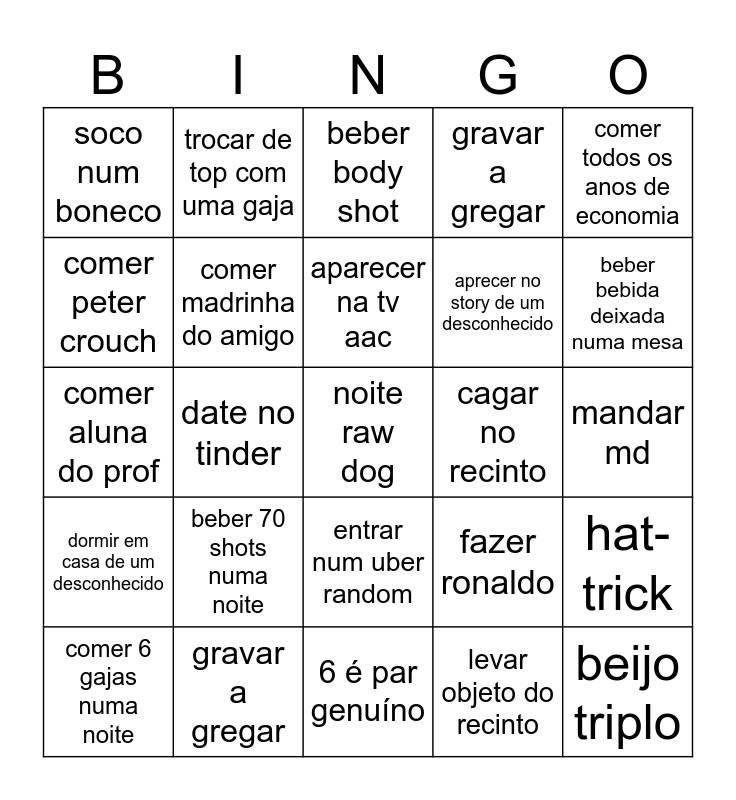 This bingo card has a free space and 24 words: beber 70 shots numa noite, gravar a gregar, aparecer na tv aac, comer 6 gajas numa noite, comer todos os anos de economia, soco num boneco, comer peter crouch, trocar de top com uma gaja, cagar no recinto, entrar num uber random, aprecer no story de um desconhecido, comer aluna do prof, fazer ronaldo, hat-trick, comer madrinha do amigo, levar objeto do recinto, mandar md, beber body shot, beber bebida deixada numa mesa, date no tinder, beijo triplo, dormir em casa de um desconhecido, gravar a gregar and 6 é par genuíno.