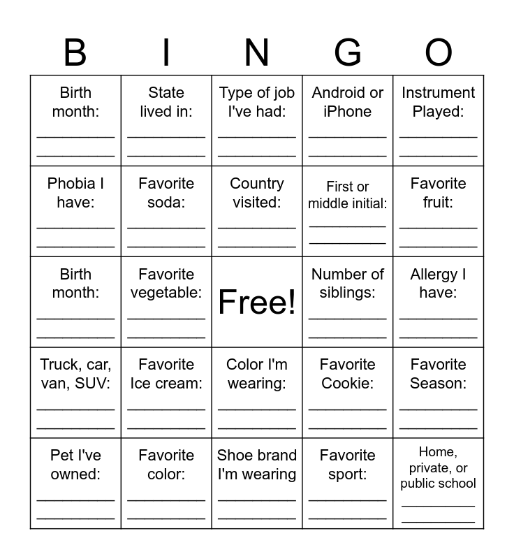 This bingo card has a free space and 24 words: Favorite Ice cream: _________ _________, Favorite color: _________ _________, Country visited: _________ _________, Pet I've owned: _________ _________, Instrument Played: _________ _________, Birth month: _________ _________, Phobia I have: _________ _________, State lived in: _________ _________, Number of siblings: _________ _________, Color I'm wearing: _________ _________, First or middle initial: __________ __________, Birth month: _________ _________, Favorite Cookie: _________ _________, Favorite Season: _________ _________, Favorite soda: _________ _________, Favorite sport: _________ _________, Allergy I have: _________ _________, Type of job I've had: _________ _________, Favorite fruit: _________ _________, Favorite vegetable: _________ _________, Home, private, or public school __________ __________, Truck, car, van, SUV: _________ _________, Android or iPhone _________ _________ and Shoe brand I'm wearing _________ _________.