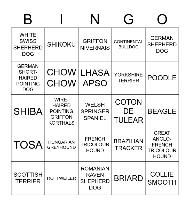 This bingo card has 75 words: NORWEGIAN ELKHOUND BLACK, SEALYHAM TERRIER, GRIFFON NIVERNAIS, GRIFFON BRUXELLOIS, OLD DANISH POINTING DOG, AUSTRALIAN SILKY TERRIER, BERNESE MOUNTAIN DOG, RUSSIAN TOY, NORFOLK TERRIER, BERGAMASCO SHEPHERD DOG, COLLIE SMOOTH, ISTRIAN WIRE-HAIRED HOUND, LHASA APSO, GERMAN SHORT- HAIRED POINTING DOG, WEIMARANER, WIRE-HAIRED POINTING GRIFFON KORTHALS, DEERHOUND, WELSH SPRINGER SPANIEL, OTTERHOUND, GERMAN SHEPHERD DOG, BORZOI - RUSSIAN HUNTING SIGHTHOUND, SHIBA, CHOW CHOW, SHIKOKU, CONTINENTAL BULLDOG, SHAR PEI, WELSH CORGI (PEMBROKE), BULL TERRIER, ITALIAN CANE CORSO, SALUKI, MAREMMA AND THE ABRUZZES SHEEPDOG, DEUTSCH STICHELHAAR, CURLY COATED RETRIEVER, BRAZILIAN TRACKER, POODLE, YORKSHIRE TERRIER, HUNGARIAN WIRE-HAIRED POINTER, ARIEGEOIS, BEAGLE, BRIARD, NORWEGIAN ELKHOUND GREY, HALDEN HOUND, ENGLISH SPRINGER SPANIEL, RHODESIAN RIDGEBACK, FRENCH BULLDOG, BOXER, SCOTTISH TERRIER, WHITE SWISS SHEPHERD DOG, BAVARIAN MOUNTAIN SCENT HOUND, TRANSMONTANO MASTIFF, CROATIAN SHEPHERD DOG, FRENCH TRICOLOUR HOUND, CAUCASIAN SHEPHERD DOG, BORDER TERRIER, SAINT MIGUEL CATTLE DOG, WEST SIBERIAN LAIKA, PYRENEAN MASTIFF, PARSON RUSSELL TERRIER, VALENCIAN TERRIER, DOBERMANN, HUNGARIAN GREYHOUND, BEAGLE HARRIER, POLISH HOUND, KARELIAN BEAR DOG, NOVA SCOTIA DUCK TOLLING RETRIEVER, COTON DE TULEAR, SOUTH RUSSIAN SHEPHERD DOG, PYRENEAN MOUNTAIN DOG, ARTOIS HOUND, GREAT ANGLO-FRENCH TRICOLOUR HOUND, TOSA, ROTTWEILER, BLUE GASCONY GRIFFON, ROMANIAN RAVEN SHEPHERD DOG and BASSET HOUND.