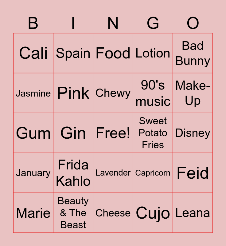 This bingo card has a free space and 31 words: Cheese, Mexico, Gin, Belle, Cali, Food, Pink, Capricorn, Sweet Potato Fries, Cujo, Disney, Leana, Ghirardelli Sundae, Karol G, Make-Up, D.R, Feid, Frida Kahlo, January, Lavender, Bad Bunny, Bojangles, Marie, Spain, 90's music, Jasmine, Lotion, Gum, Beauty & The Beast, Chewy and Lola.