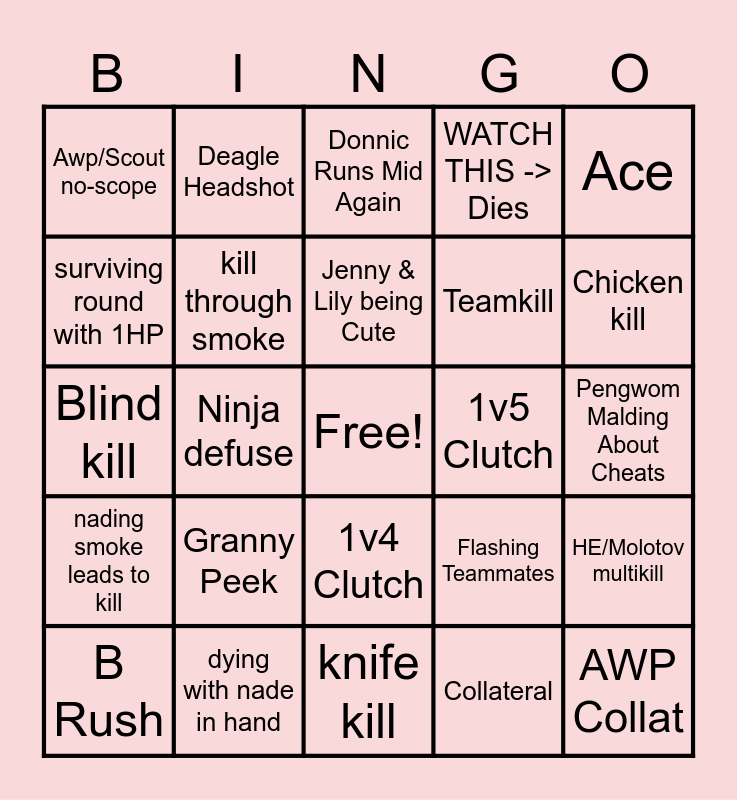 This bingo card has a free space and 24 words: Granny Peek, dying with nade in hand, Jenny & Lily being Cute, B Rush, Ace, Awp/Scout no-scope, surviving round with 1HP, Deagle Headshot, 1v5 Clutch, 1v4 Clutch, Teamkill, Blind kill, Flashing Teammates, HE/Molotov multikill, kill through smoke, Collateral, Pengwom Malding About Cheats, Donnic Runs Mid Again, Chicken kill, Ninja defuse, AWP Collat, nading smoke leads to kill, WATCH THIS -> Dies and knife kill.