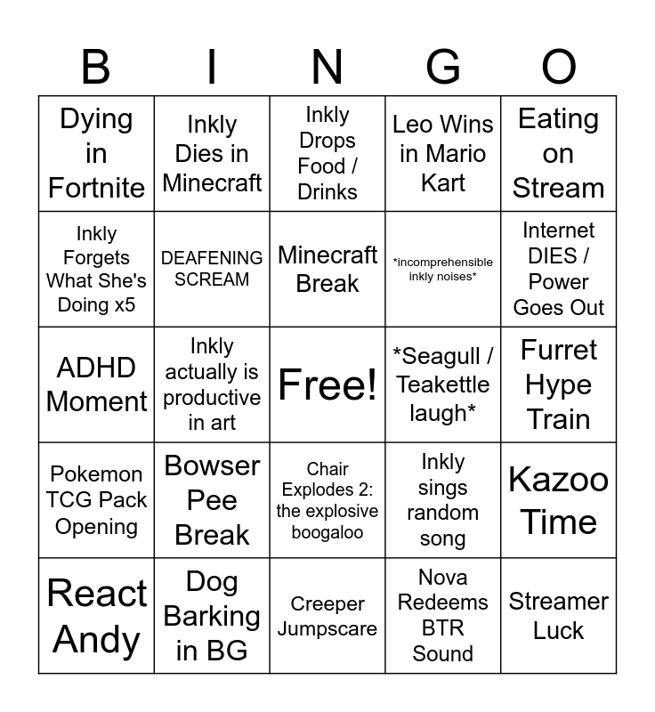 This bingo card has a free space and 24 words: Bowser Pee Break, Dog Barking in BG, Minecraft Break, React Andy, Eating on Stream, Dying in Fortnite, Inkly Forgets What She's Doing x5, Inkly Dies in Minecraft, *Seagull / Teakettle laugh*, Chair Explodes 2: the explosive boogaloo, *incomprehensible inkly noises*, ADHD Moment, Inkly sings random song, Kazoo Time, DEAFENING SCREAM, Nova Redeems BTR Sound, Furret Hype Train, Inkly Drops Food / Drinks, Internet DIES / Power Goes Out, Inkly actually is productive in art, Streamer Luck, Pokemon TCG Pack Opening, Leo Wins in Mario Kart and Creeper Jumpscare.
