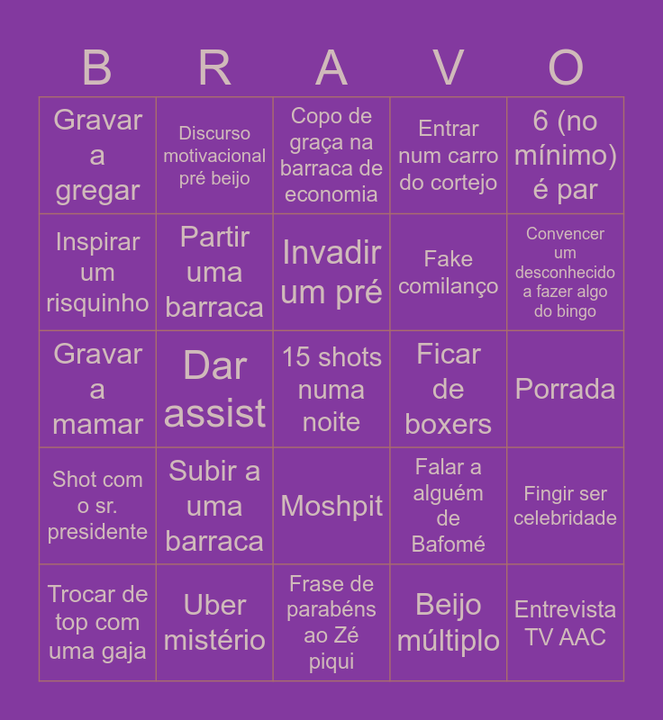 This bingo card has a free space and 24 words: Subir a uma barraca, Uber mistério, Invadir um pré, Trocar de top com uma gaja, 6 (no mínimo) é par, Gravar a gregar, Inspirar um risquinho, Discurso motivacional pré beijo, Ficar de boxers, Moshpit, Fake comilanço, Gravar a mamar, Falar a alguém de Bafomé, Fingir ser celebridade, Partir uma barraca, Beijo múltiplo, Porrada, Copo de graça na barraca de economia, Convencer um desconhecido a fazer algo do bingo, Dar assist, Entrevista TV AAC, Shot com o sr. presidente, Entrar num carro do cortejo and Frase de parabéns ao Zé piqui.