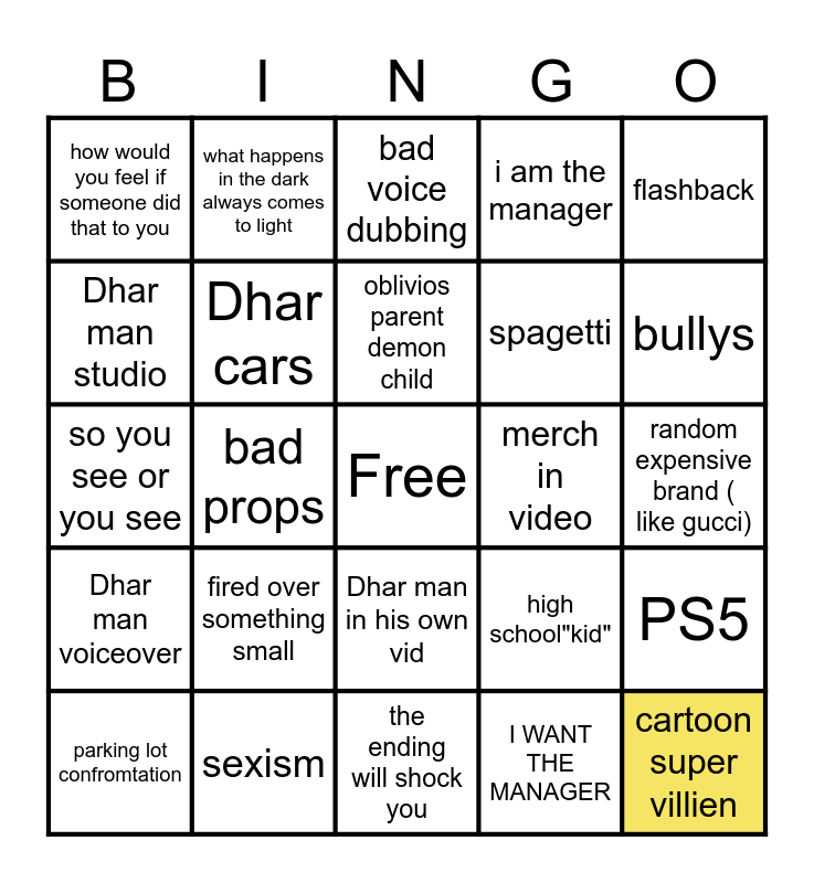 This bingo card has a free space and 29 words: parking lot confromtation, creep behavior, bad props, wrong person mad, how would you feel if someone did that to you, bad voice dubbing, Dhar cars, fired over something small, merch in video, sexism, random expensive brand ( like gucci), cartoon super villien, the ending will shock you, I WANT THE MANAGER, bullys, extrem coinesedence, Dhar man in his own vid, Dhar man voiceover, flashback, so you see or you see, high school"kid", Dhar man mentioned, spagetti, Dhar man studio, i am the manager, what happens in the dark always comes to light, PS5, oblivios parent demon child and ipad kids.