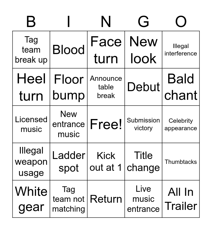 This bingo card has a free space and 27 words: Title change, Champion retains, Debut, Return, Heel turn, Face turn, Blood, Illegal weapon usage, Submission victory, Thumbtacks, Licensed music, New look, White gear, Tag team not matching, Bald chant, Video game gear, Floor bump, Announce table break, Ladder spot, Tag team break up, Celebrity appearance, Live music entrance, New entrance music, All In Trailer, Kick out at 1, Illegal interference and Lights out.