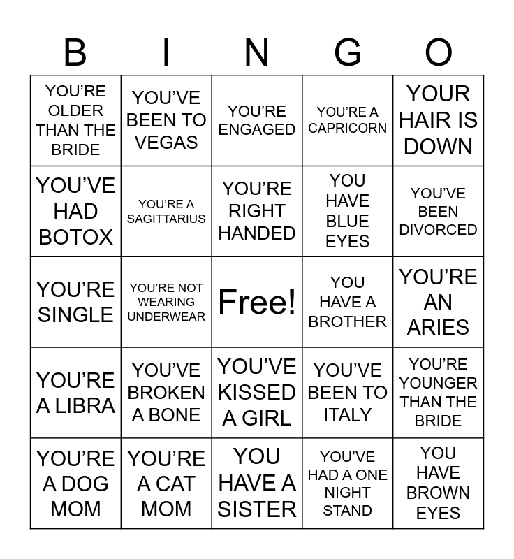 This bingo card has a free space and 39 words: YOU’RE SINGLE, YOU’RE BLONDE, YOU’RE BRUNETTE, YOU HAVE BLUE EYES, YOU HAVE BROWN EYES, YOU’RE A LIBRA, YOU’RE A SAGITTARIUS, YOU’RE A TAURUS, YOU’RE A CAPRICORN, YOU’RE AN ARIES, YOU’VE HAD BOTOX, YOU’VE BEEN TO VEGAS, YOU’VE BEEN TO AUSTRALIA, YOU’VE BEEN TO ITALY, YOU’VE BEEN DIVORCED, YOU’RE SINGLE, YOU’RE MARRIED, YOU’RE ENGAGED, YOU HAVE A TATTOO, YOU’RE YOUNGER THAN THE BRIDE, YOU’RE OLDER THAN THE BRIDE, YOU’VE BROKEN A BONE, YOU HAVE A SISTER, YOU HAVE A BROTHER, YOU’VE GIVEN BIRTH, YOU’RE A DOG MOM, YOU’RE A CAT MOM, YOU HAVE CURLY HAIR, YOUR HAIR IS UP, YOUR HAIR IS DOWN, BRIDE HAS KISSED YOU ON THE MOUTH, YOU’RE LEFT HANDED, YOU’RE RIGHT HANDED, YOU’VE HAD A ONE NIGHT STAND, YOU’VE BEEN ON A BLIND DATE, YOU MET YOUR PARTNER ONLINE, YOU’RE NOT WEARING UNDERWEAR, YOU’VE KISSED A GIRL and YOU’RE VEGETARIAN.