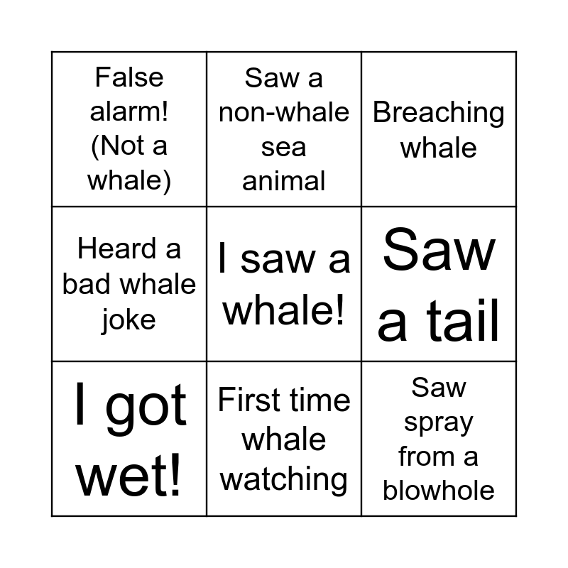 This bingo card has 9 words: I got wet!, Breaching whale, Saw a non-whale sea animal, Heard a bad whale joke, False alarm! (Not a whale), Saw a tail, I saw a whale!, Saw spray from a blowhole and First time whale watching.