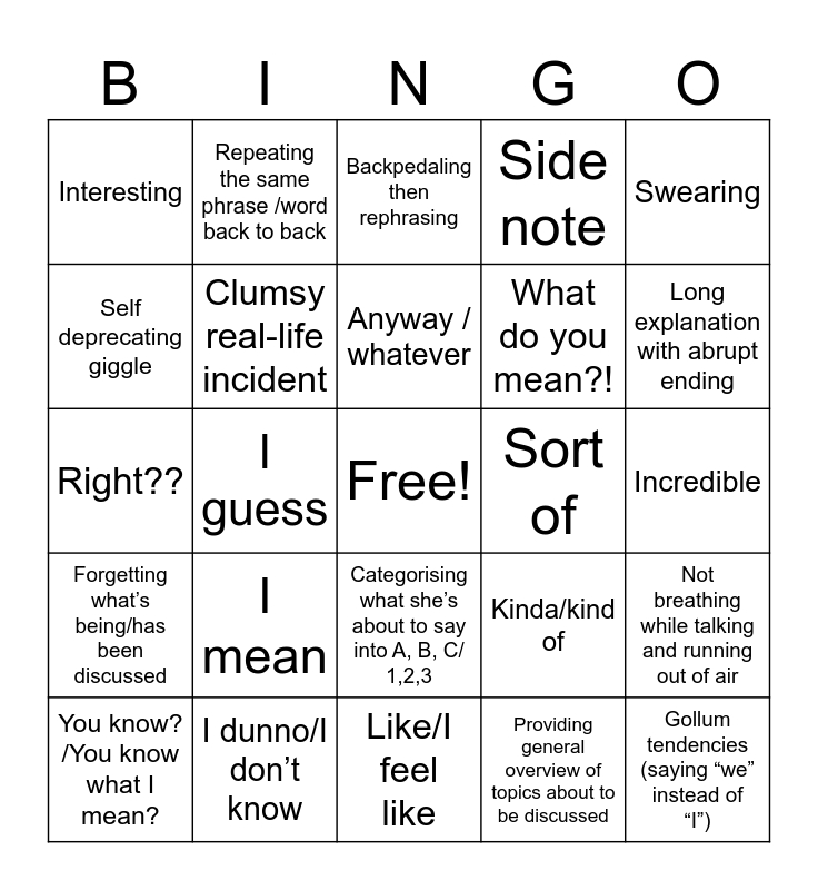 This bingo card has a free space and 24 words: I mean, I dunno/I don’t know, Anyway / whatever, You know? /You know what I mean?, Swearing, Interesting, Self deprecating giggle, Repeating the same phrase /word back to back, Sort of, Categorising what she’s about to say into A, B, C/ 1,2,3, What do you mean?!, Right??, Kinda/kind of, Not breathing while talking and running out of air, Clumsy real-life incident, Providing general overview of topics about to be discussed, Incredible, Backpedaling then rephrasing, Long explanation with abrupt ending, I guess, Gollum tendencies (saying “we” instead of “I”), Forgetting what’s being/has been discussed, Side note and Like/I feel like.