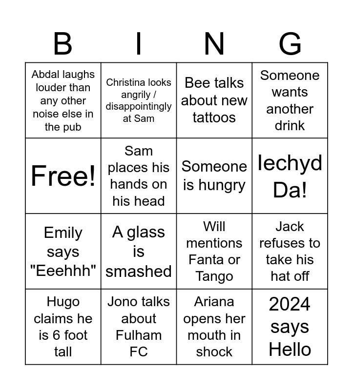 This bingo card has 16 words: Jono talks about Fulham FC, Jack refuses to take his hat off, Bee talks about new tattoos, Abdal laughs louder than any other noise else in the pub, Emily says "Eeehhh", Christina looks angrily / disappointingly at Sam, Will mentions Fanta or Tango, Ariana opens her mouth in shock, Free!, Sam places his hands on his head, Hugo claims he is 6 foot tall, Someone wants another drink, A glass is smashed, Iechyd Da!, Someone is hungry and 2024 says Hello.