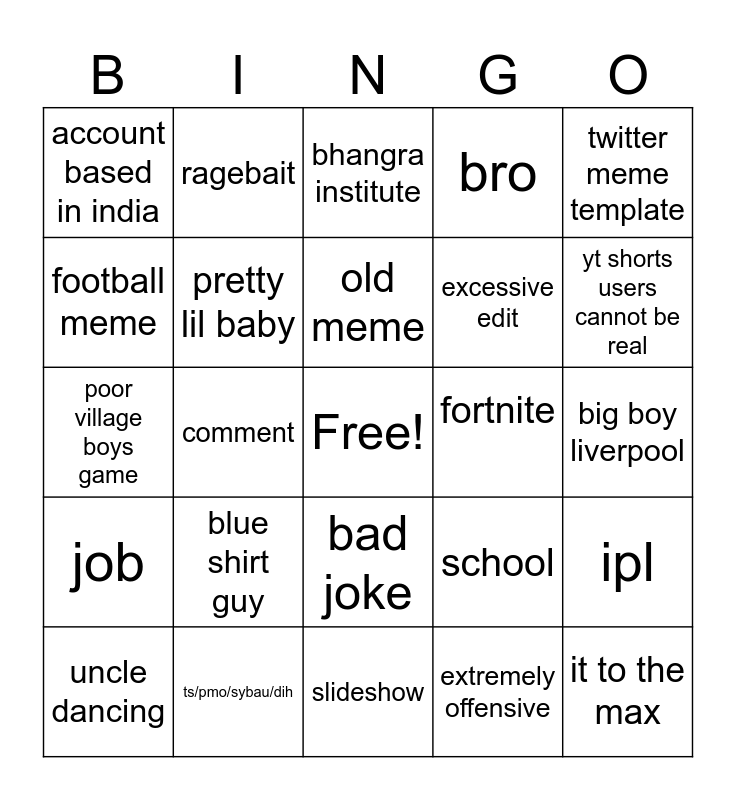 This bingo card has a free space and 24 words: blue shirt guy, ts/pmo/sybau/dih, old meme, uncle dancing, twitter meme template, account based in india, football meme, ragebait, fortnite, bad joke, excessive edit, poor village boys game, school, ipl, pretty lil baby, extremely offensive, big boy liverpool, bhangra institute, yt shorts users cannot be real, comment, it to the max, job, bro and slideshow.