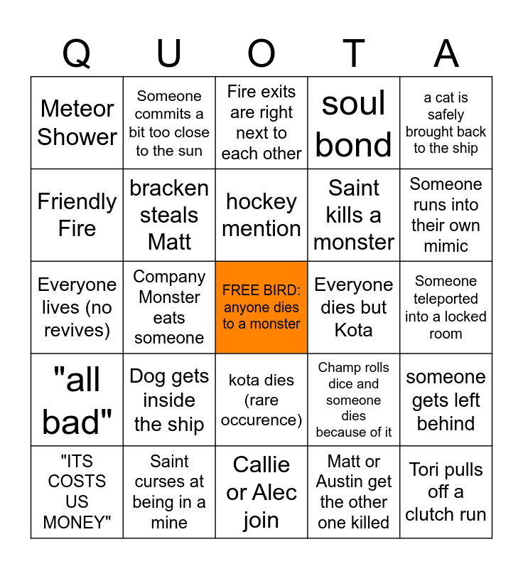 This bingo card has a free space and 27 words: Champ rolls dice and someone dies because of it, Marriage Mention ("wife" "husband" "married"), Saint kills a monster, Callie or Alec join, Friendly Fire, Fire exits are right next to each other, Someone commits a bit too close to the sun, "all bad", Everyone dies but Kota, someone gets left behind, Everyone lives (no revives), soul bond, "ITS COSTS US MONEY", Saint curses at being in a mine, Someone runs into their own mimic, someone besides Champ rolls dice, bracken steals Matt, hockey mention, Dog gets inside the ship, Meteor Shower, Someone teleported into a locked room, Matt or Austin get the other one killed, Company Monster eats someone, Tori pulls off a clutch run, kota dies (rare occurence), a cat is safely brought back to the ship and 0 credit earned in a run.