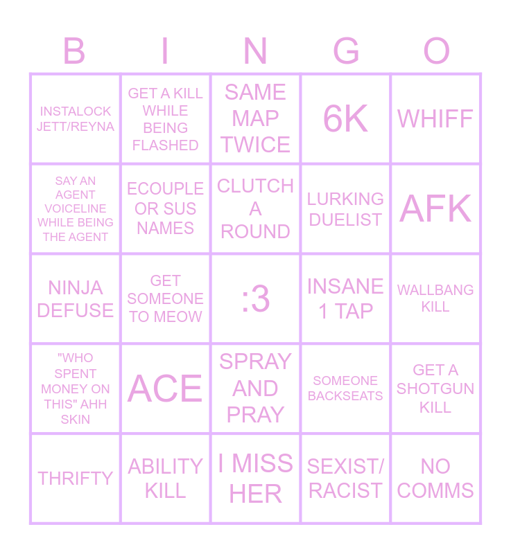 This bingo card has a free space and 24 words: ACE, ABILITY KILL, CLUTCH A ROUND, THRIFTY, WHIFF, INSTALOCK JETT/REYNA, SAY AN AGENT VOICELINE WHILE BEING THE AGENT, GET A KILL WHILE BEING FLASHED, INSANE 1 TAP, SPRAY AND PRAY, LURKING DUELIST, NINJA DEFUSE, SOMEONE BACKSEATS, GET A SHOTGUN KILL, ECOUPLE OR SUS NAMES, SEXIST/ RACIST, WALLBANG KILL, SAME MAP TWICE, AFK, GET SOMEONE TO MEOW, NO COMMS, "WHO SPENT MONEY ON THIS" AHH SKIN, 6K and I MISS HER.