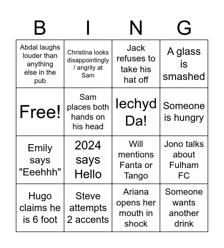 This bingo card has 16 words: Steve attempts 2 accents, Jono talks about Fulham FC, Jack refuses to take his hat off, Abdal laughs louder than anything else in the pub, Emily says "Eeehhh", Christina looks disappointingly / angrily at Sam, Will mentions Fanta or Tango, Ariana opens her mouth in shock, Free!, Sam places both hands on his head, Hugo claims he is 6 foot, A glass is smashed, 2024 says Hello, Someone is hungry, Iechyd Da! and Someone wants another drink.