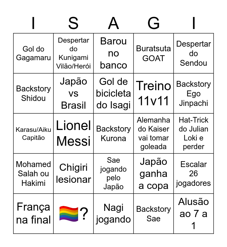 This bingo card has 25 words: Chigiri lesionar, Nagi jogando, Gol de bicicleta do Isagi, França na final, Despertar do Sendou, Gol do Gagamaru, Backstory Shidou, Despertar do Kunigami Vilão/Herói, Alemanha do Kaiser vai tomar goleada, Sae jogando pelo Japão, Treino 11v11, Karasu/Aiku Capitão, Japão ganha a copa, Escalar 26 jogadores, Japão vs Brasil, Alusão ao 7 a 1, Hat-Trick do Julian Loki e perder, Barou no banco, Backstory Ego Jinpachi, Lionel Messi, Backstory Kurona, 🏳️🌈?, Mohamed Salah ou Hakimi, Buratsuta GOAT and Backstory Sae.