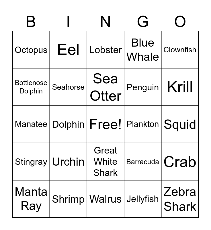 This bingo card has a free space and 35 words: Sea Turtle, Whale, Orca, Seahorse, Great White Shark, Blue Whale, Bottlenose Dolphin, Starfish, Sea Otter, Sea Anemone, Manatee, Clownfish, Sea Lion, Mollusca, Octopus, Plankton, Jellyfish, Dolphin, Stingray, Zebra Shark, Barracuda, Manta Ray, Crab, Shrimp, Lobster, Krill, Barnacle, Fish, Penguin, Squid, Clam, Walrus, Urchin, Eel and Mussel.