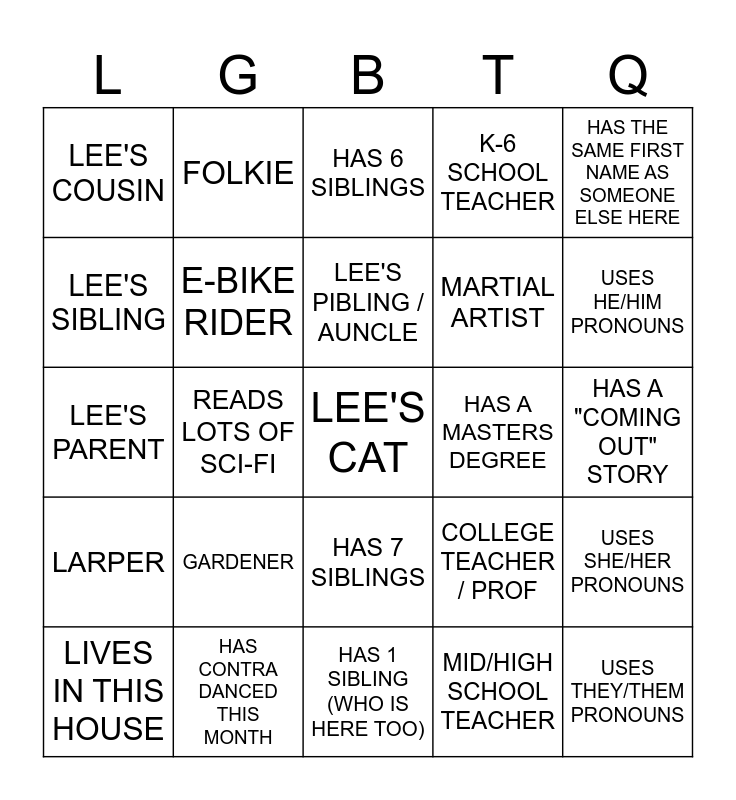 This bingo card has a free space and 24 words: LIVES IN THIS HOUSE, GARDENER, LEE'S PIBLING / AUNCLE, MID/HIGH SCHOOL TEACHER, HAS THE SAME FIRST NAME AS SOMEONE ELSE HERE, LEE'S COUSIN, FOLKIE, HAS 6 SIBLINGS, HAS A MASTERS DEGREE, HAS A "COMING OUT" STORY, LEE'S PARENT, E-BIKE RIDER, COLLEGE TEACHER / PROF, USES SHE/HER PRONOUNS, LEE'S SIBLING, HAS CONTRA DANCED THIS MONTH, HAS 1 SIBLING (WHO IS HERE TOO), K-6 SCHOOL TEACHER, USES HE/HIM PRONOUNS, LARPER, READS LOTS OF SCI-FI, HAS 7 SIBLINGS, MARTIAL ARTIST and USES THEY/THEM PRONOUNS.