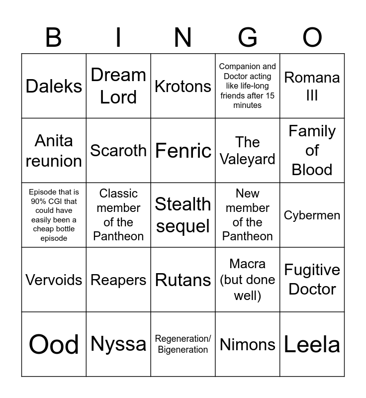 This bingo card has 25 words: Vervoids, Nyssa, Stealth sequel, Nimons, Romana III, Daleks, Dream Lord, Krotons, New member of the Pantheon, Fugitive Doctor, Anita reunion, Scaroth, Regeneration/ Bigeneration, Macra (but done well), Family of Blood, Ood, Classic member of the Pantheon, Fenric, The Valeyard, Cybermen, Episode that is 90% CGI that could have easily been a cheap bottle episode, Reapers, Rutans, Companion and Doctor acting like life-long friends after 15 minutes and Leela.