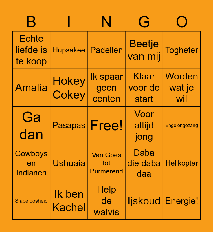 This bingo card has a free space and 80 words: Satisfyer, Boevenpad, Padellen, Ontsnappen, Entourage, Tijdmachine, Feestje om de hoek, Iconisch, Gaan we weg, Sugerdaddy, Adrenaline, 100%, Beetje van mij, Echte liefde is te koop, Ruggengraat, Amalia, Huisfeestje, Ushuaia, Vleugels, Engelengezang, Hallo wereld, Togheter, Ga dan, Ik spaar geen centen, Hokey Cokey, Alles op gevoel, A.P.T., Ken je dat gevoel, Springen nondejuh, Hotel, Worden wat je wil, Links rechts, Help de walvis, Hartslag van de stad, Slapeloosheid, Voor altijd jong, La Festa, Schultenbräu, De wereld is van jou, Energie!, Zoet, zout, zuur, Van Brabant naar Bordeaux, Baila bailalaa, Parcetamollen, In de schuur, Hupsakee, Pinguïndans, Terug in de tijd, Lekker eigenwijs, Haai alarm!, Helikopter, Pasapas, Daba die daba daa, C'est La vie, In Spanje, Alles wordt beter, Terug bij af, Feest!, Engelbewaarder, Van Goes tot Purmerend, Klaar voor de start, FitTop 10, Atlas, Zij aan zij, Europapa, Hier mag alles, Goud, Nooit meer regen, Blikkendag, Automatisch, Cowboys en Indianen, Ik ben Kachel, Mango mango, Toeter op m'n waterscooter, Musica, Rainbow in the sky, Ijskoud, Dans met tante Rita, Ons moeder zeej nog and Kabouterdans.