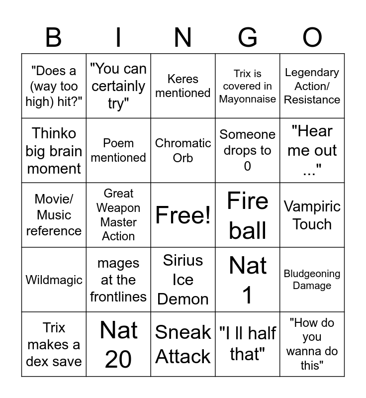 This bingo card has a free space and 24 words: mages at the frontlines, Nat 20, Chromatic Orb, Trix makes a dex save, Legendary Action/ Resistance, "Does a (way too high) hit?", Thinko big brain moment, "You can certainly try", Fire ball, Sirius Ice Demon, Someone drops to 0, Movie/ Music reference, Nat 1, Bludgeoning Damage, Poem mentioned, "I ll half that", Vampiric Touch, Keres mentioned, "Hear me out ...", Great Weapon Master Action, "How do you wanna do this", Wildmagic, Trix is covered in Mayonnaise and Sneak Attack.